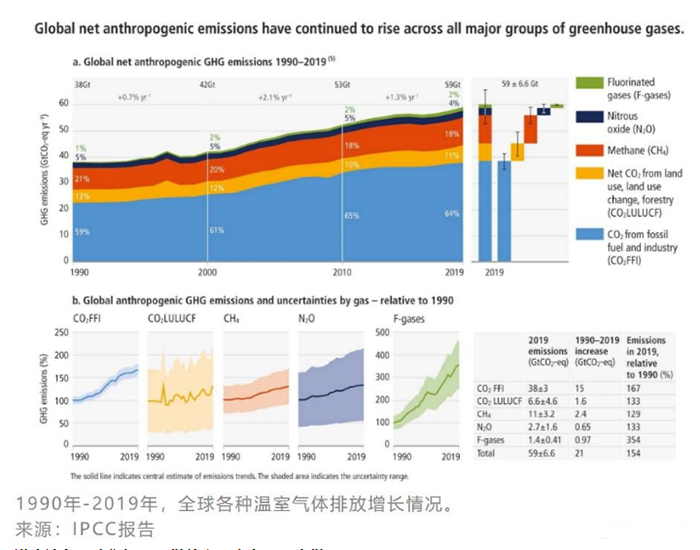 目前聯合國政府間氣候變化專門委員會(IPCC)發布3000頁最新報告,題為 《氣候變化2022:減緩氣候變化》。報告顯示,2010-2019年全球溫室氣體年平均排放量處于人類歷史上的最高水平, 2019年的排放量達到590億噸,這比2010年全球525億噸的排放量躍升了12%,即過去10年平均每年增長1.3%。