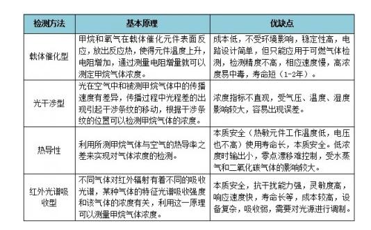此外檢測甲烷氣體濃度的測量方法還區(qū)分有:載體催化型、光干涉型、熱導型和紅外光譜吸收型,幾種檢測方法的特點見下表: