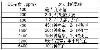 一般空氣中一氧化碳濃度值含量一旦超過800ppm,便會使人痙攣(即失去自我控制活動能力,無力阻止環境的進一步惡化,從而導致昏迷、死亡的危險)。所以對正常人來講,室內一氧化碳濃度800ppm是一個重要界限值,超過此值,即成為有中毒危險的環境。